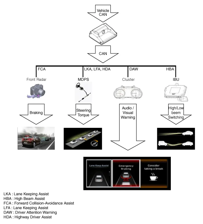 | 2. | Lane Keeping Assist (LKA): This driving safety system sends warning to the driver for possible dangers and controls the steering wheel when the system judges that the car is off the lane , reducing the risk of getting into an accident while driving. The LKA sends the driver the visual / audible / tactical warning by using the data about lanes, which is obtained by the front camera, the operational status of the turn signal lights, and helps the driver to avoid the collision by assisting to control the steering wheel. However, the front camera may not operate normally in certain situations where the locations or the boundaries of the lanes are hard to be identified.