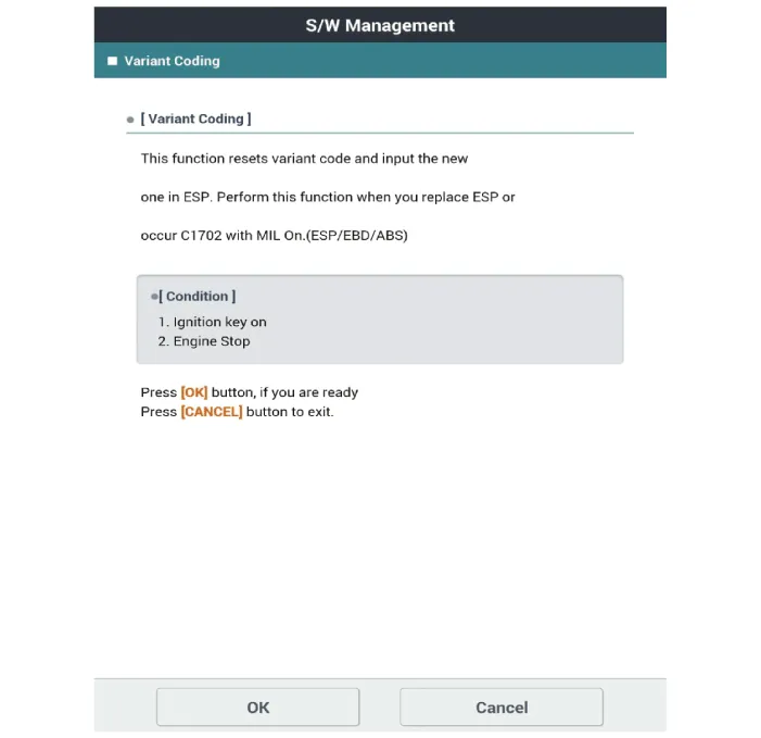 | 2. | Select the "vehicle model" and "ESP/ESC" on GDS vehicle selection screen, then select OK. [Variant Code Reset]