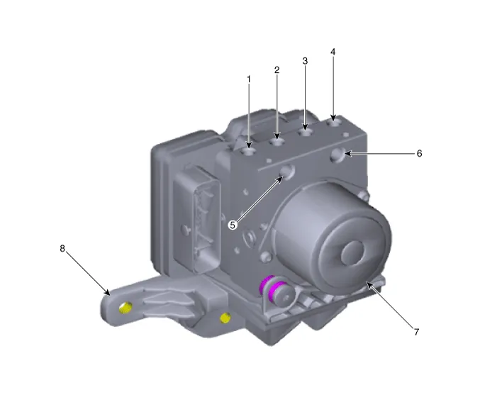 | 1. Front - right (FR) 2. Rear - left (RL) 3. Rear - right (RR) 4. Front - left (FL) | 5. MC2 6. MC1 7. ABS control module (HECU) 8. Bracket |