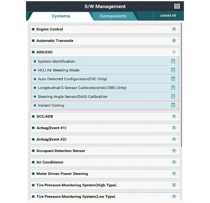 | 2. | Select the "vehicle model" and "ESP/ESC" on GDS vehicle selection screen, then select OK. [Variant Code Reset]