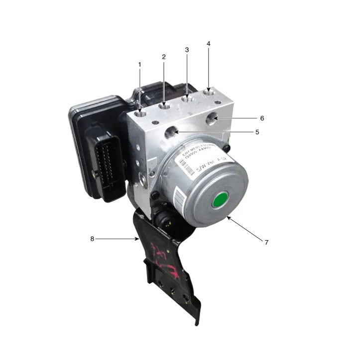 | 1. Front - right (FR) 2. Rear - left (RL) 3. Rear - right (RR) 4. Front - left (FL) | 5. MC2 6. MC1 7. ABS control module (HECU) 8. Bracket |