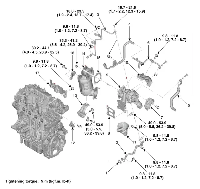 | 1. Oil drain pipe gasket 2. Oil drain pipe 3. Oil feed pipe 4. Torbo charhe water outlet hose & pipe B 5. Torbo charhe water inlet pipe 6. Torbo charhe water outlet pipe A 7. Electric waste gate actuator (EWGA) 8. Exhaust manifold gasket 9. Exhaust manifold & Turbo charger | 10. Exhaust manifold heat protector A 11. Exhaust manifold heat protector B 12. Intercooler pipe braket 13. Exhaust manifold & Turbo charger stay bracket 14. Warm up catalytic converter 15. Warm up catalytic converter gasket 16. Warm up catalytic converter upper stay bracket 17. Cylinder head heat peotector |
