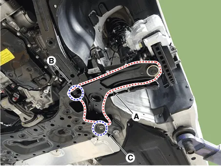 | 5. | Remove the front lower arm (A) after loosening the mounting bolts.