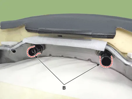 | 6. | Press the both hook (B) and remove the headrest guides (A) by pulling upward.