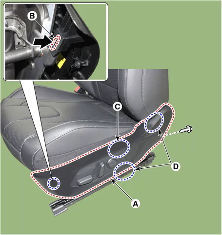 | 3. | Loosen the mounitng screw, separate the clip (C) and hook (D) and then press the lock pin (B), remove the front seat outer shield outer cover (A).