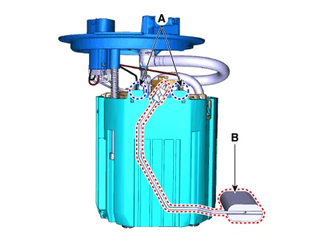 Repair procedures Inspection[Fuel Pump]1.Turn ignition switch OFF and disconnect the negative (-) battery cable.2.Remove the fuel pump assembly.3.Check motor operation by fuel pump connector (A) connecting power (No.