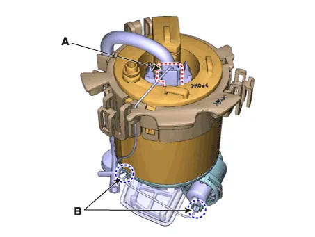 Repair procedures Removal1.Remove the fuel pump. (Refer to Fuel Delivery System - "Fuel Pump")2.Disconnect the fuel pump motor connector (A) and fuel sender connector (B).
