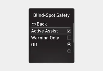 With the engine on, select or deselect ‘Driver Assistance → Blind-Spot Safety’ from the Settings menu to set whether or not to use each function.