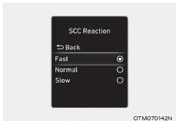 With the engine on, select ‘Driver Assistance → SCC Reaction’ from the settings menu to select the sensitivity of vehicle speed when following the front vehicle to maintain the set distance.