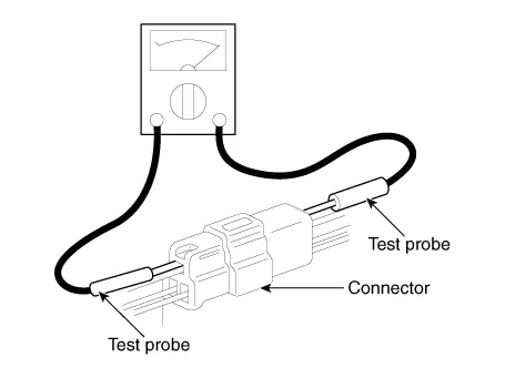 | 11. | When using a circuit tester to check continuity or voltage on connector terminals, insert the test probe into the harness side. If the connector is a sealed connector, insert the test probe through the hole in the rubber cap until the probe contacts the terminal, being careful not to damage the insulation of the wires.
