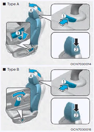 3. Press the head restraint release button (3) while pulling the head restraint up (4).