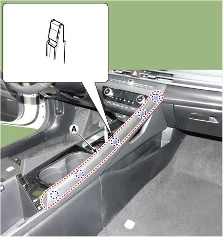 | 3. | Remove the floor console side garnish (A) by using the screw driver or remover.