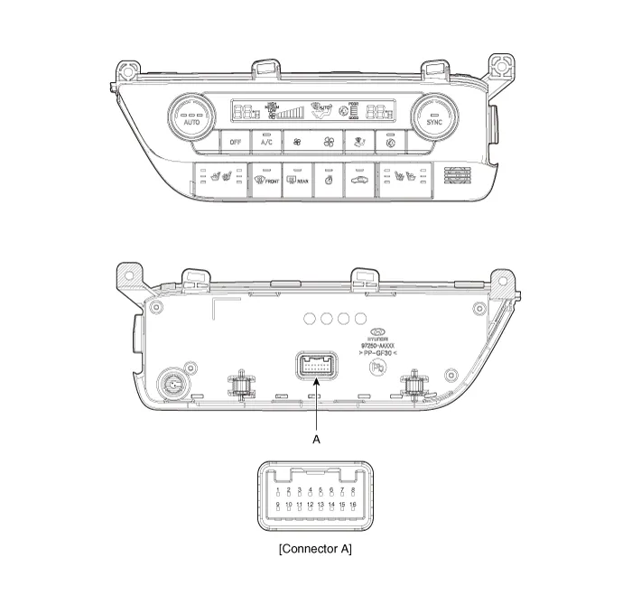 Components and components location Components[This illustration shows the LHD type. RHD type is symmetrical.][Connector A] Pin No Function Pin No Function 1Low (Register specifications)4Middle Low (Register specifications)2Common (Register specifications)5Middle High (Register specifications)3Ground (Register specifications)6High (Register specifications)[Connector B] Pin No Function Pin No Function 1Battery (+)21IGN22ISG B+22IGN13ILL+ (TAIL)23Blower IS (PWM specifications)4Sensor REF (+5V)24-5Mode control actuator (Feedback)25-6Temperature control actuator (Feedback)26-7Intake actuator (Feedback)27Blower Max.