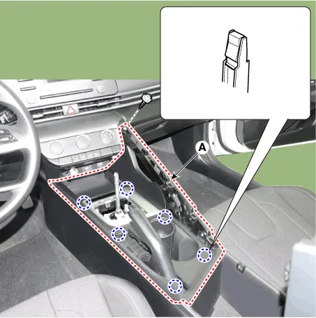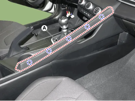 | 5. | Using a screwdriver or remover, remove the floor console side garnish (A).