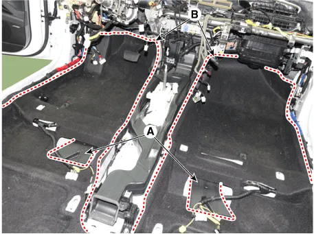 | 22. | Remove the rear air duct (A) and separate the floor carpet (B) to obtain space for removing the rear heating duct.