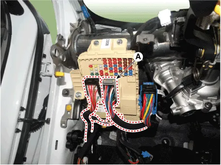 | 21. | Disconnect the airbag control module (SRSCM) connector (A).