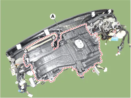 | 30. | Remove the heater and blower unit (A) from the crash pad after loosening the mounting nuts.
