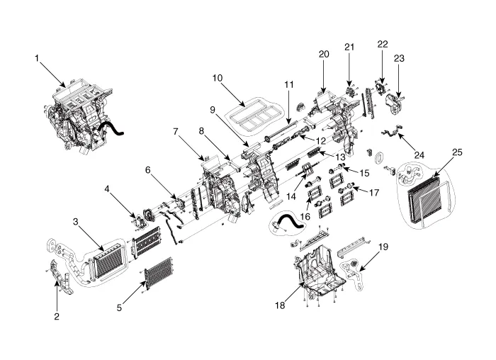 | 1. Heater unit assembly 2. Heater tube cover 3. Heater core assembly 4. Mode control actuator [LH] 5. Dummy PTC 6. Temperature control actuator [LH] 7. Heater case [LH] 8. Separator (Out) 9. Heater case [CTR] | 10. Heater & Blower duct seal 11. DEF door assembly 12. Vent door assembly 13. Floor door assembly 14. Mode door assembly 15. Shaft temperature door 16. Temperature door assembly 17. Shaft temperature door 18. Heater lower cover | 19. Drain hose 20. Heater case [RH] 21. Intake acutator 22. Temperature control actuator [RH] 23. Shower duct [RH] 24. Evaporator temperature sensor 25. Evaporator core assembly |