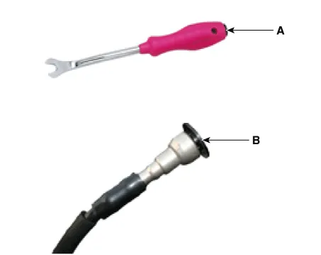 | 7. | Use the special service tool [SST No. : 09314-3Q100 or 09314-27130] to remove the high pressure fuel pipe function block mounting bolt (A) and removing the flange nut (B).