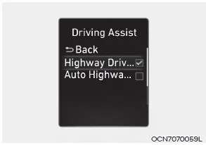 -- If ‘Highway Driving Assist’ is selected, it helps maintain distance from the vehicle ahead, maintain the set speed, and helps center the vehicle in the lane.
