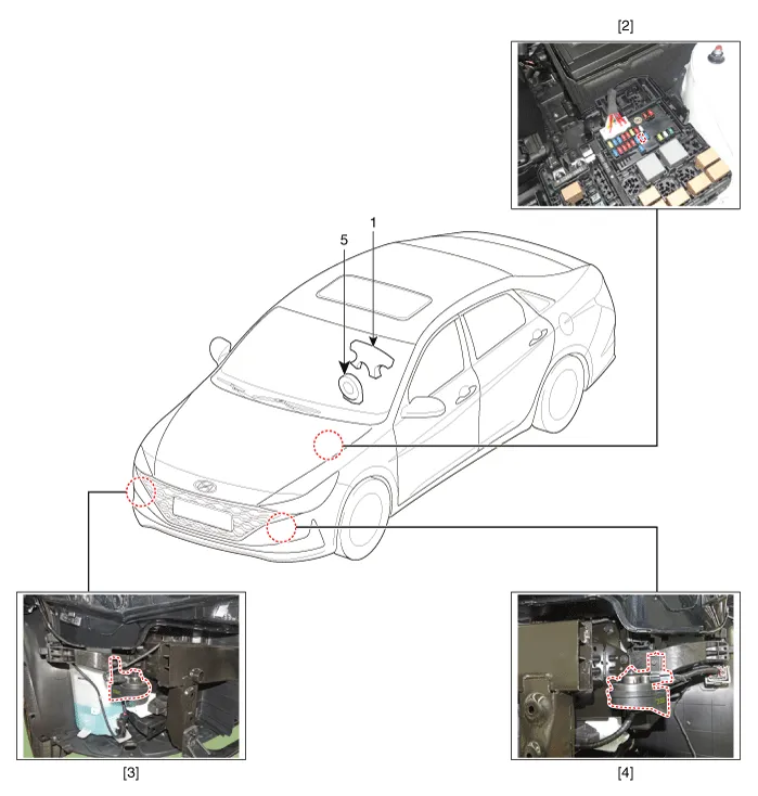 | 1. Horn switch 2. Horn relay (Engine room compartment) 3. Horn (Low pitch) | 4. Horn (High pitch) 5. Clock spring |