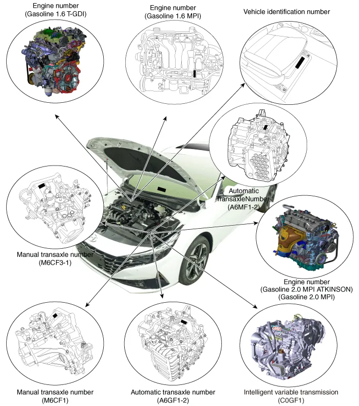 | 6. | Engine type - B : Gasoline Engine (GAMMA G 1.6 MPI) - E : Gasoline Engine (GAMMA II G 1.6 MPI) - F : Gasoline Engine (GAMMA II G 1.6 T-GDI) - G : Gasoline Engine (NU G 2.0 MPI) |