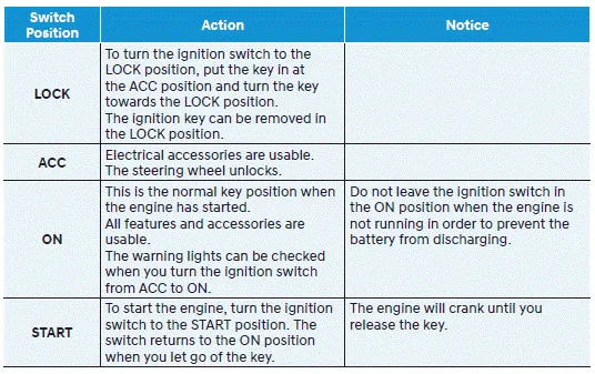 Key ignition switch positions