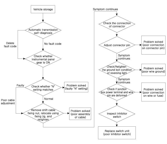 | Shift lever not operating Gear not marked on cluster Shock occurs while shifting lever Warning lamp ON Engine OFF while vehicle is parked | Inhibitor switch circuit abnormal Inhibitor switch function abnormal | Check the inspection FLOW and replace the inhibitor switch |