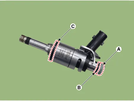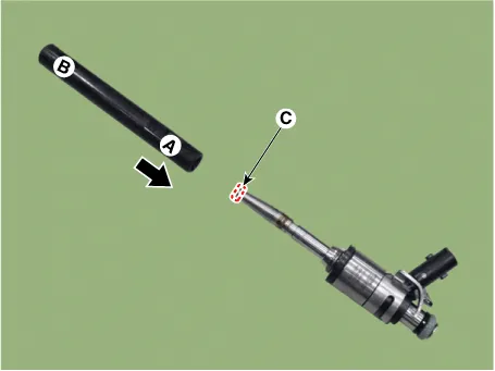 | 3. | Place the seal installing guide (B) (SST No. : 09353-2B000) on the tip of the injector not to damage the injector tip (A). Push the sealing ring (C) with thumb and index finger over the conical assembly tool until it snaps into the groove. The complete assembly must not take longer than 2 to 3 seconds.