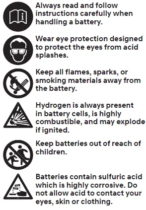 To prevent SERIOUS INJURY or DEATH to you or bystanders, always follow these precautions when working near or handling the battery: