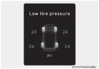 This warning message is displayed if the tire pressure is low. The corresponding tire on the vehicle will be illuminated.