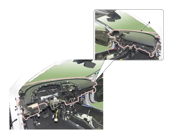 | 29. | Loosen the mounting bolts and nuts and remove the main crash pad assembly (A).