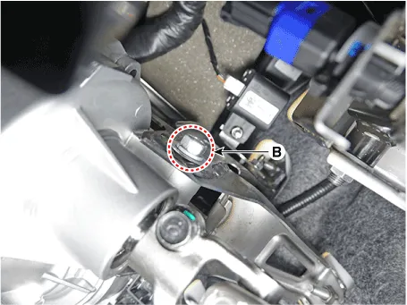 | 12. | Remove the steering column assembly after loosening the mounting nuts (A) and bolt (B).