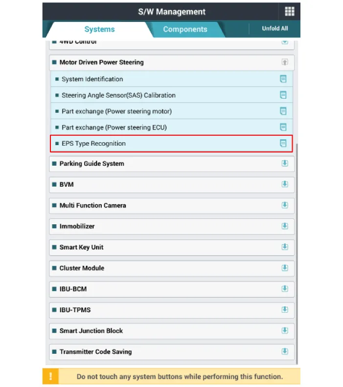 | 4. | After Selecting the "vehicle model" and "system", select the "EPS Type Recognition" on diagnostic tool vehicle selection screen.