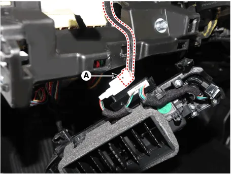 | 7. | Loosen the mounting screw and connector and remove the crash pad mood lamp [LH] (A).