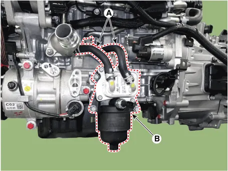 | 6. | Disconnect the oil cooler hoses (A), and then remove the oil filter & cooler assembly (B).