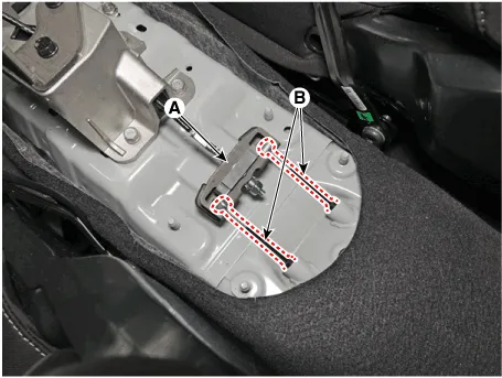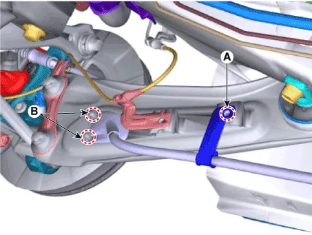 | 11. | Remove the parking brake cable bracket after loosening the mounting bolt (A) and nuts (B). [Rear multi link type]