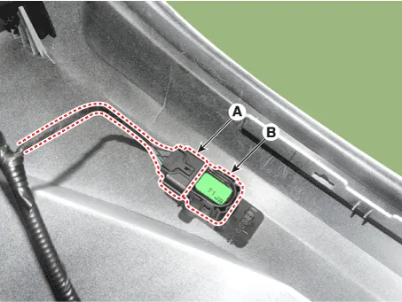 | 2. | Disconnect the ultrasonic sensor connector (A) and remove the ultrasonic sensor (B).