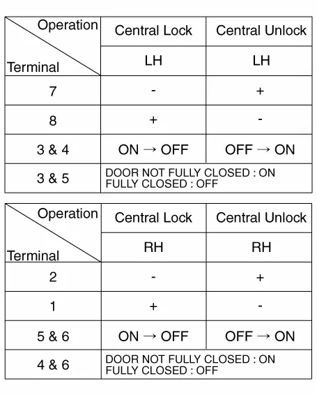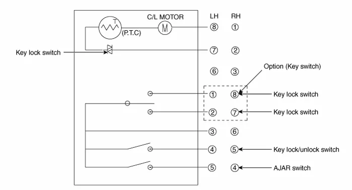 Repair procedures InspectionPower Door Lock Switch Inspection1.Check for continuity between the terminals. If there is an abnormality, replace the switch.