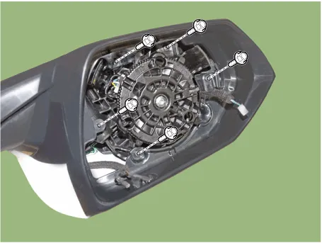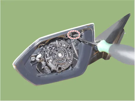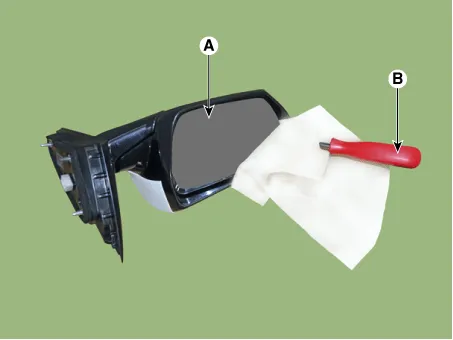 Repair procedures Removal1.Disconnect (-) battery terminal.2.Using a fastener remover (C), remove the mirror (A) as illustration below. • Protect mirror from removing tool with cloth (B) wrapped.