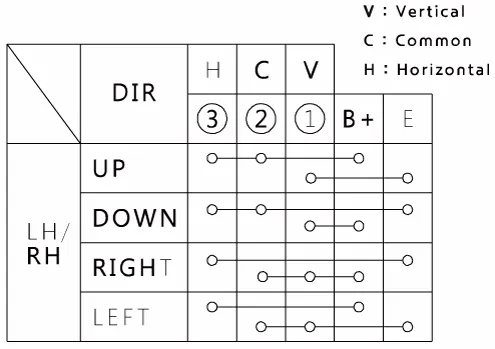 | 4. | Apply battery voltage to each terminal as shown in the table and verify that the mirror operates properly. [Mirror Control (LH/RT)]