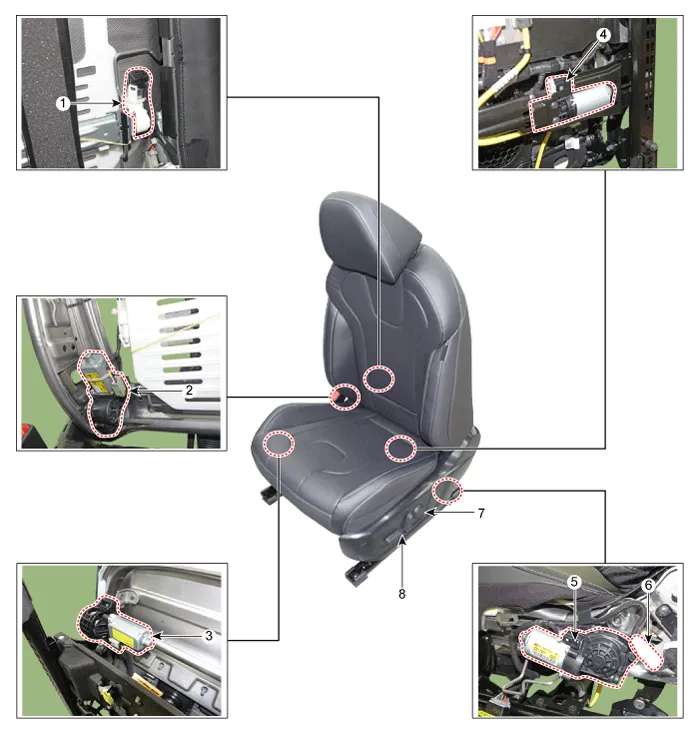 | 1. Lumber support motor 2. Reclining motor 3. Front height motor 4. Slide motor | 5. Rear height motor 6. Reclining limit switch 7. Lumber support switch 8. Seat switch |