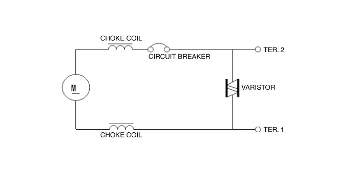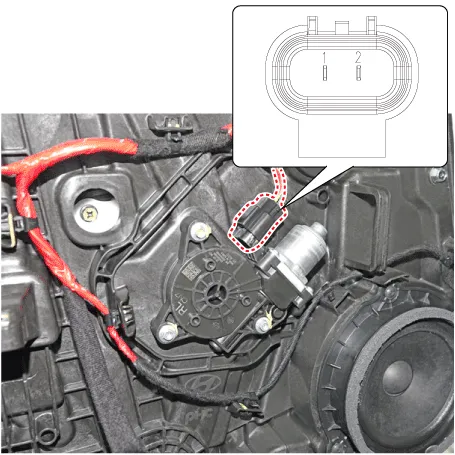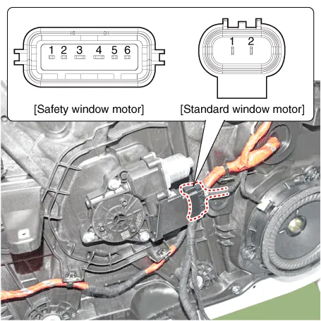 | 4. | Connect the motor terminals No.1 and No.2 directly to battery voltage (12V) and check that the motor operates smoothly. If the operation is abnormal, replace the motor. [Safety Window Motor]