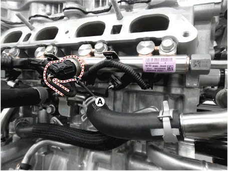 | 4. | Disconnect the rail pressure sensor connector and then remove the sensor (A) from the delivery pipe. Tightening torque : 29.4 - 34.3 N.m (3.0 - 3.5 kgf.m, 10.8 - 15.9 lb-ft) |