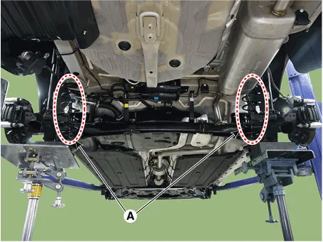 | 4. | Remove the rear shock absorver (A) from the torsion beam axle after loosening the mounting bolt.