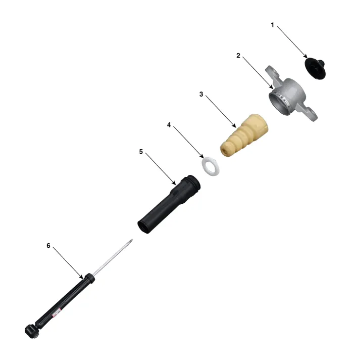 | 1. Insulator cap 2. Insulator 3. Bumper rubber | 4. Spacer 5. Dust cover 6. Rear shock absorber |