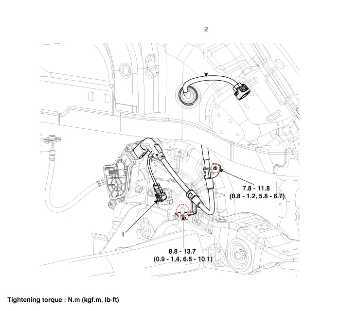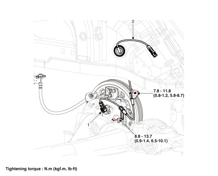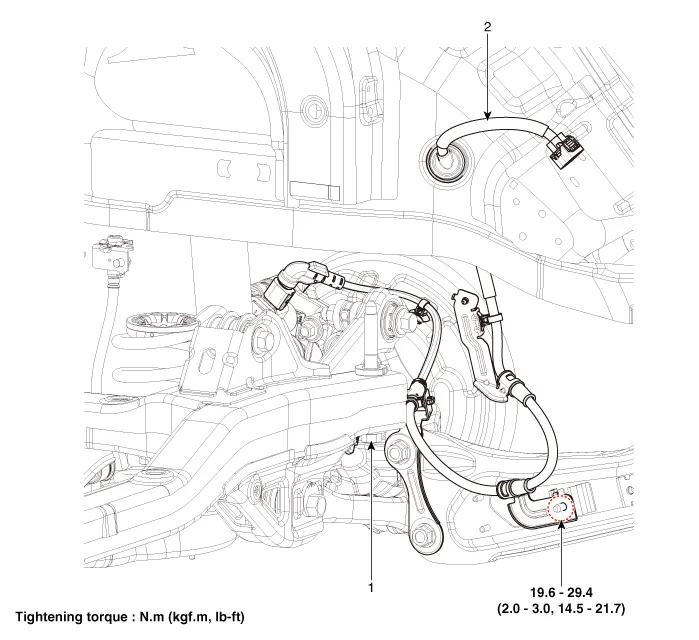 | 1. Rear wheel speed sensor | 2. Rear wheel speed sensor connector |