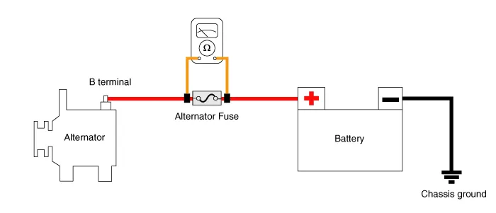 | 2. | Check the fuses for continuity. | (1) | Check the alternator fuse for continuity.