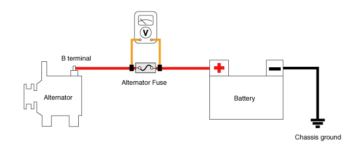 | (2) | Test | a. | Check to see that the voltmeter reads as the same value as the battery voltage. If the voltmeter reads 0V, and the open circuit in the wire between alternator "B" terminal and battery (+) terminal or poor grounding is suspected. |