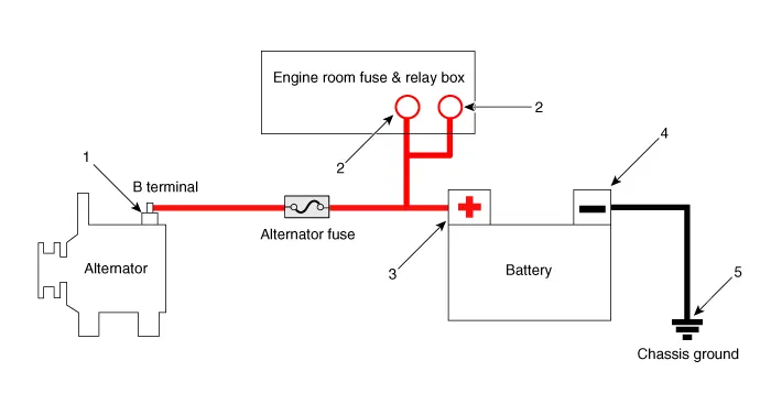1. Alternator B+ terminal 2. Engine room fuse & relay box positive (+) terminal 3. Battery negative (+) terminal